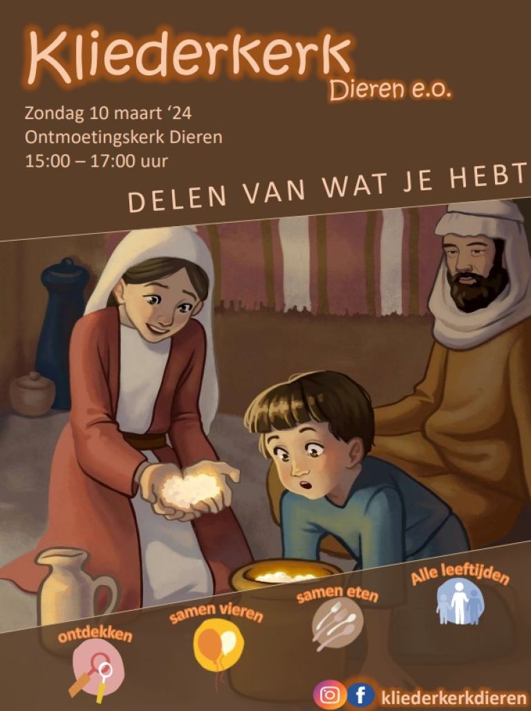 Op zondagmiddag 10 maart 2024 is er van 15 uur tot 17.00 uur weer een Kliederkerk in de Ontmoetingskerk in Dieren. Het thema van deze bijeenkomst is ‘Delen van wat je hebt’. Het Bijbelverhaal dat centraal staat is dat van Elia en de weduwe van Sarefat. De arme weduwe van Sarefat deelt van wat ze heeft en er is genoeg. Een prachtig thema over vertrouwen en omzien naar elkaar. Wat kan jij met anderen delen? Liefde, eten, je talenten, geld?